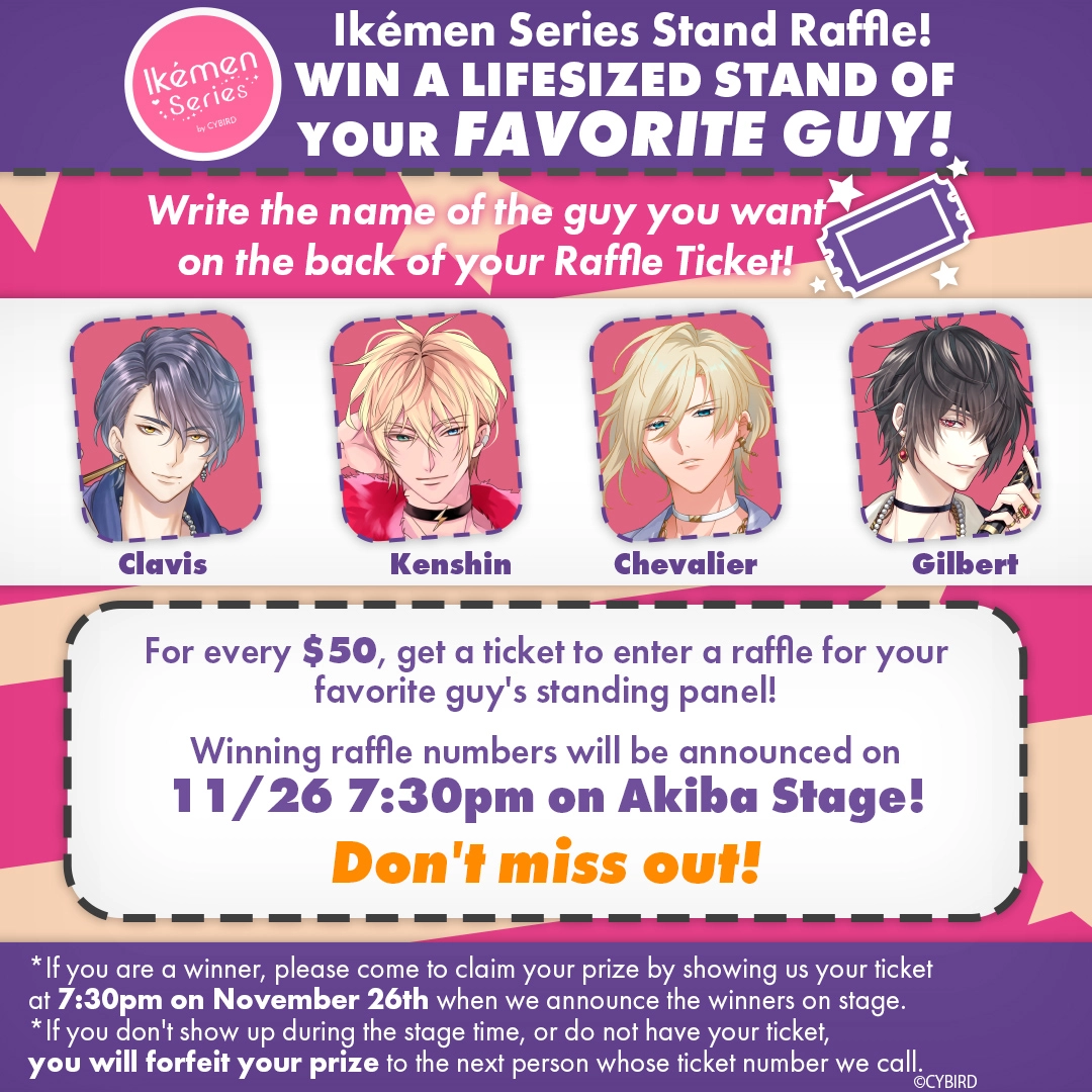 For every $50 spent, get a ticket to enter the raffle for a life-sized standee! Winners will be announced on 11/26 7:30pm at the Akiba Stage!